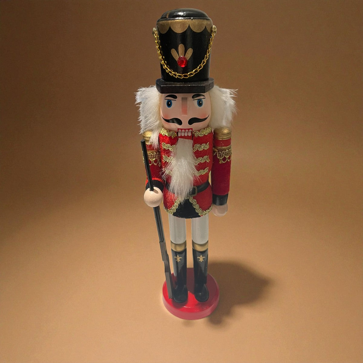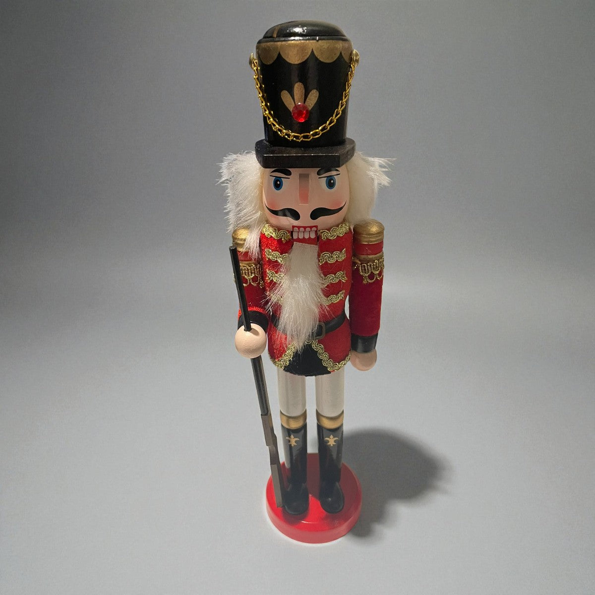Laat je huis stralen met deze klassieke houten notenkraker met geweer! Met zijn elegante rode uniform, gouden details en koninklijke uitstraling is hij een echte eyecatcher voor jouw kerstdecoratie. โจ