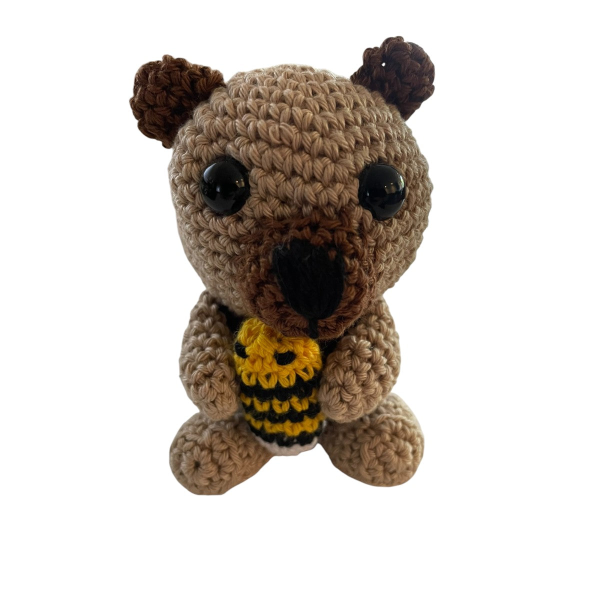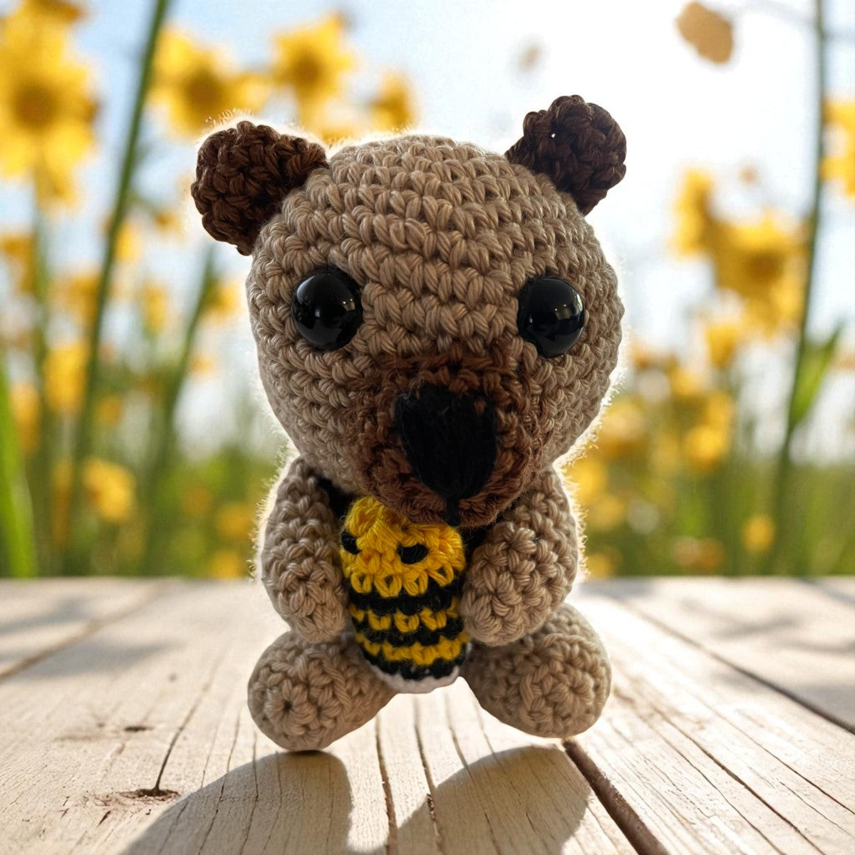 Ontmoet dit schattige handgemaakte gehaakte beertje! Met zijn lieve blik, zachte bruine tinten en een kleine gehaakte bij in zijn pootjes, is dit beertje een echte blikvanger. Perfect als knuffelbaar vriendje of als decoratie in de kinderkamer.