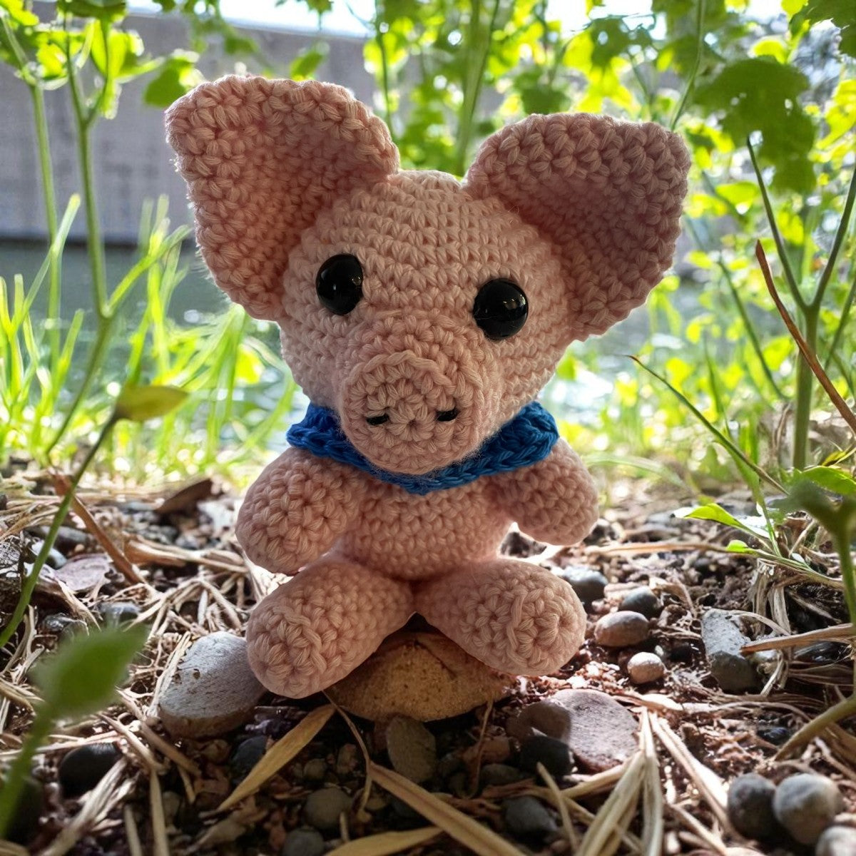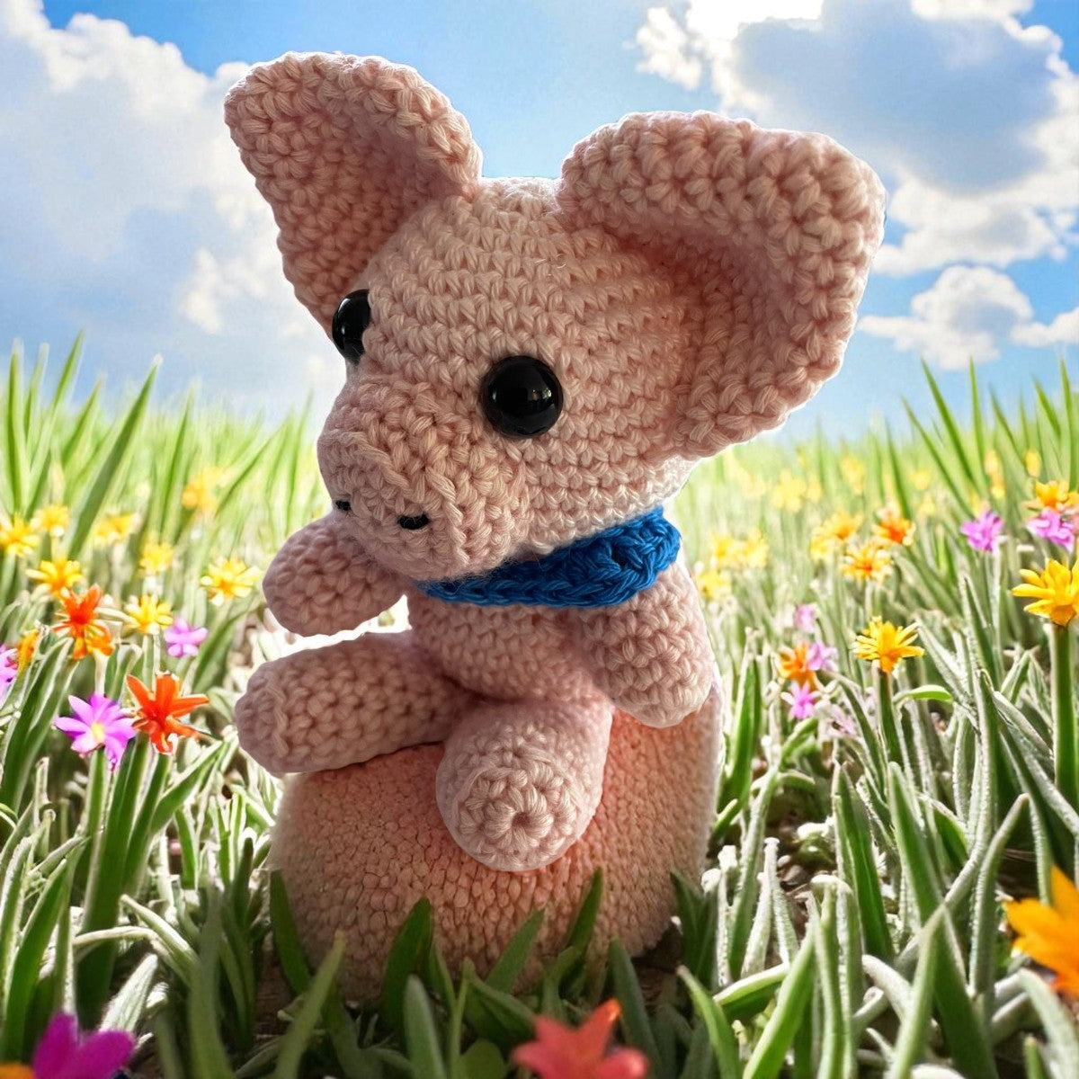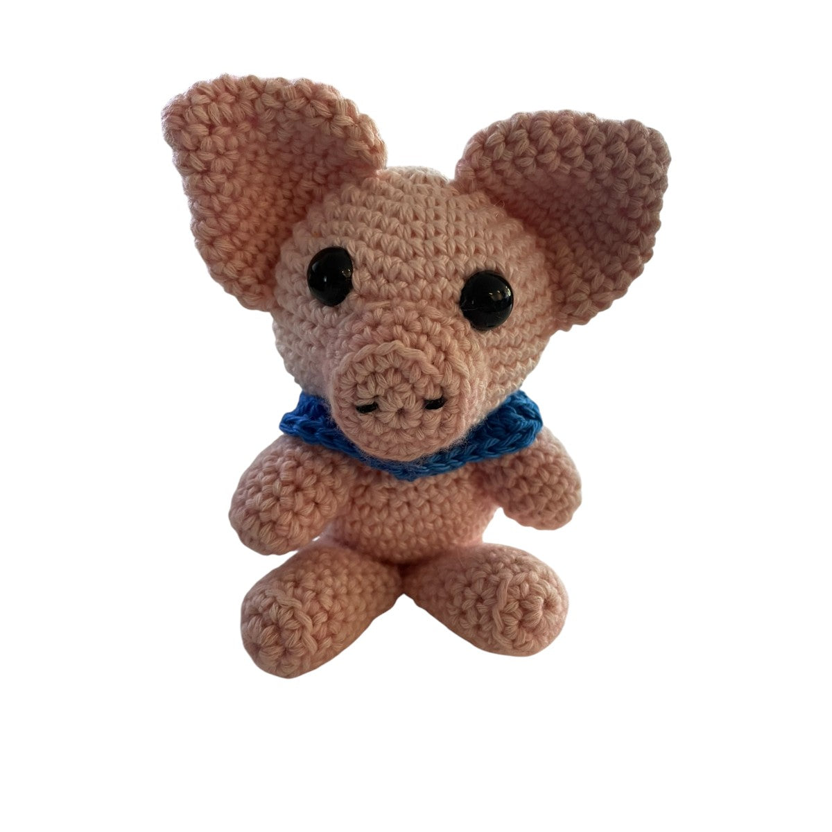 Dit handgemaakte gehaakte biggetje is een echte knuffelbare blikvanger! Met zijn grote oren, schattige roze snoetje en blauwe sjaaltje straalt hij vrolijkheid en charme uit. Een perfect cadeautje of lieve decoratie voor jong en oud.