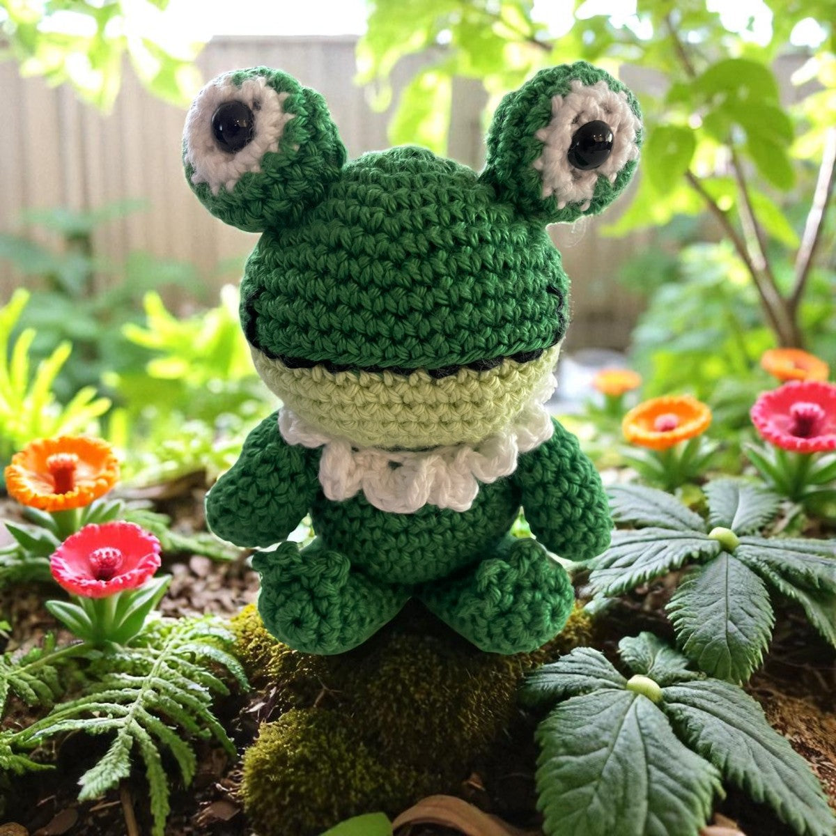 De kikker is ongeveer 10 cm hoog en met zorg gehaakt van zacht katoen garen. Elk exemplaar is uniek dankzij het handwerk, wat dit knuffeltje extra bijzonder maakt. Ideaal om cadeau te doen voor een verjaardag, geboorte of gewoon om iemand een glimlach te bezorgen.