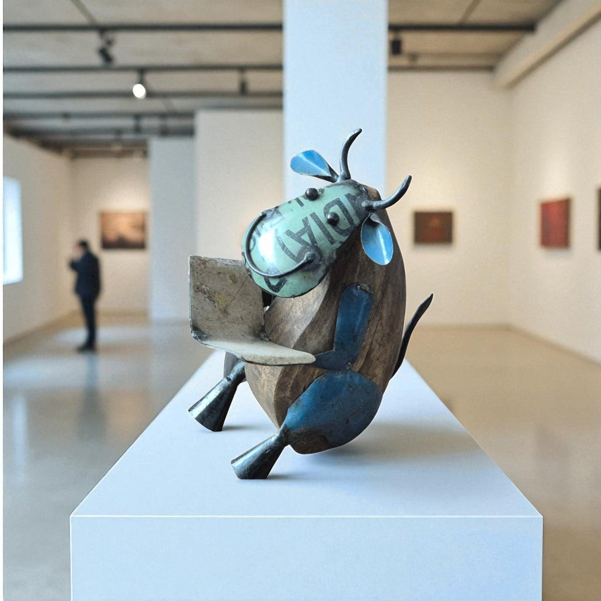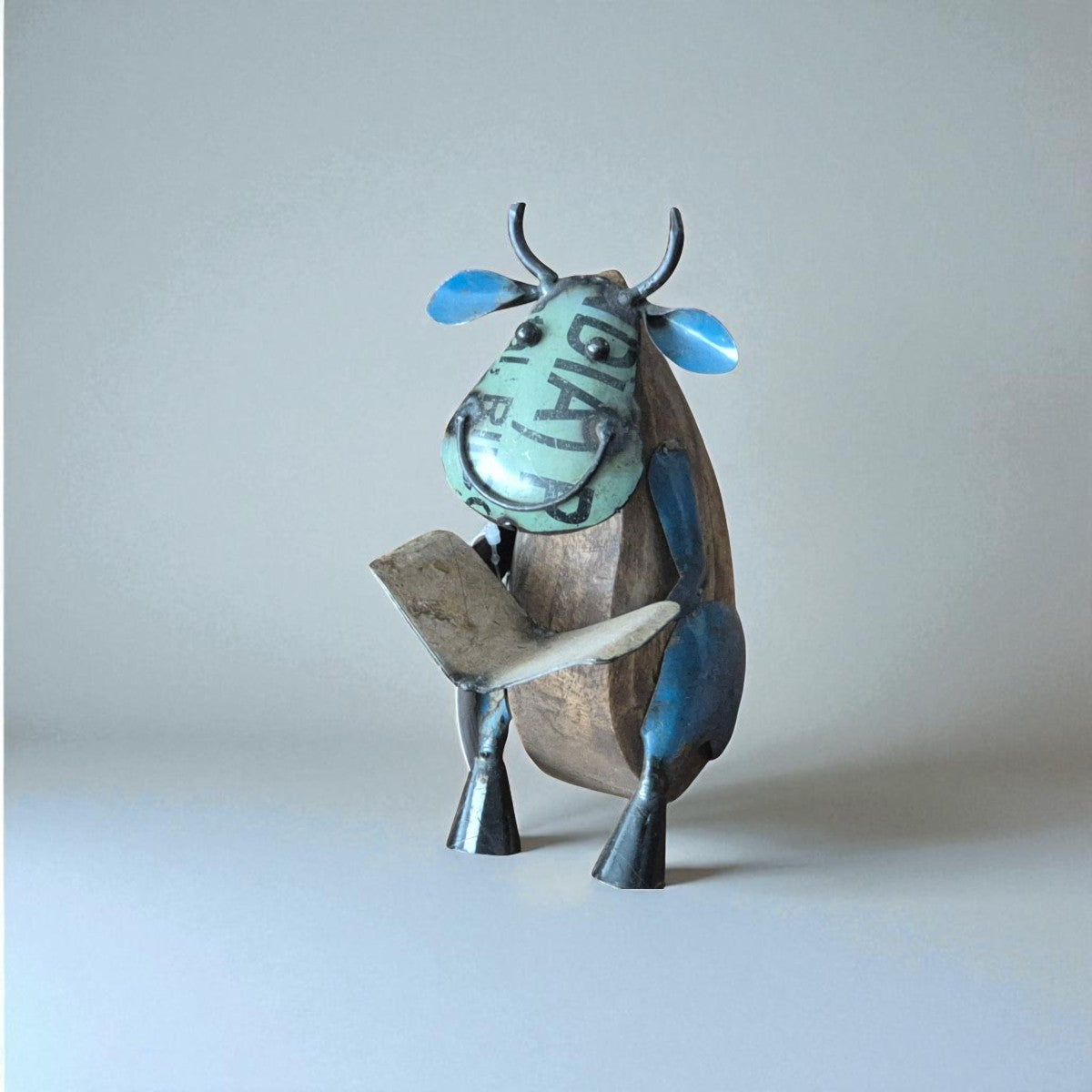 Ontdek de charmante koe met boek, een uniek decoratiebeeldje dat zorgt voor een speelse en vrolijke sfeer in huis. Deze grappige koe is gemaakt van een combinatie van hout en blik en heeft een rustieke uitstraling die perfect past in zowel een landelijk als modern interieur.