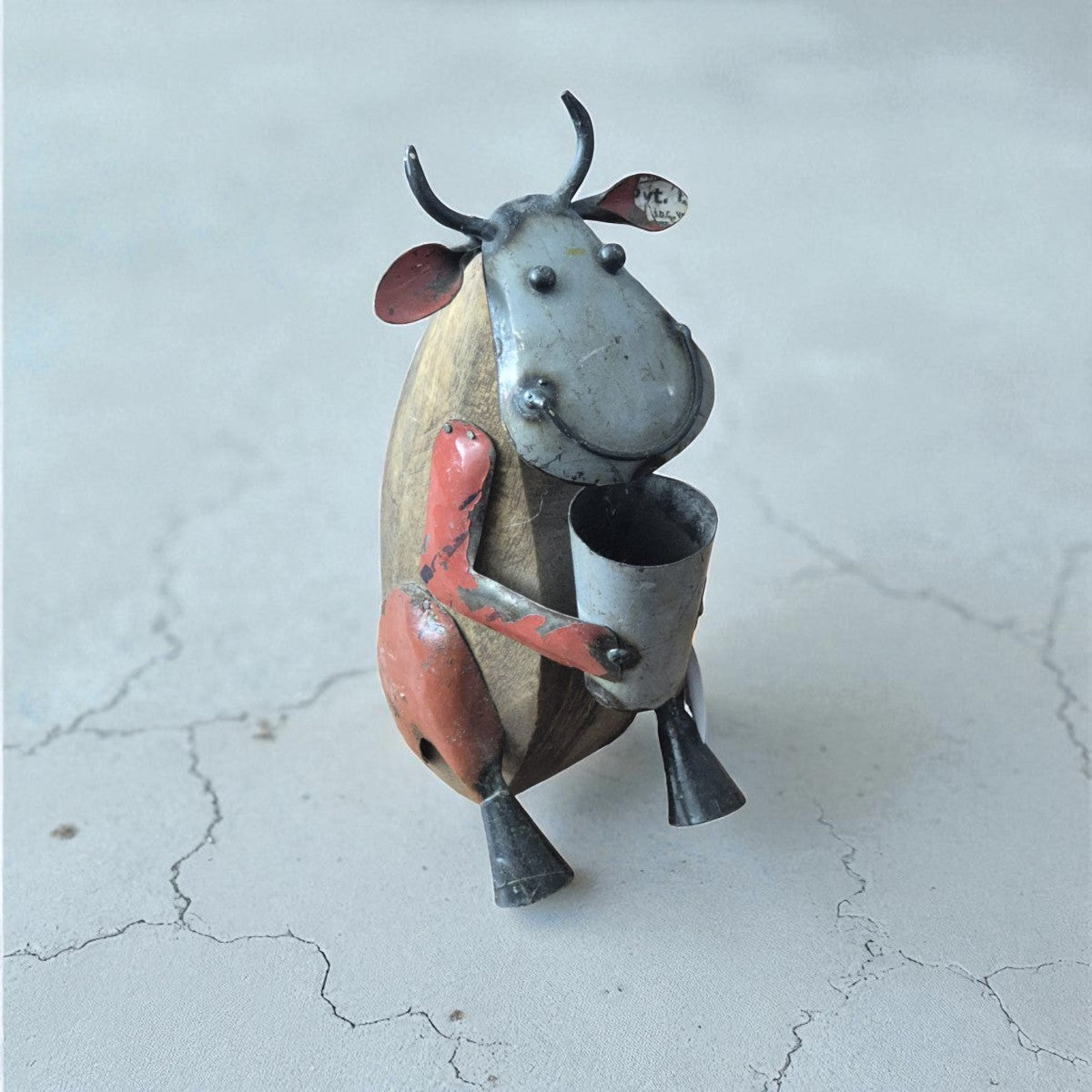 Geef je interieur een speelse en originele touch met deze koe met emmer. Dit vrolijke decoratiebeeldje is gemaakt van een combinatie van hout en voornamelijk blik en past perfect in een landelijk, bohemian of modern interieur.