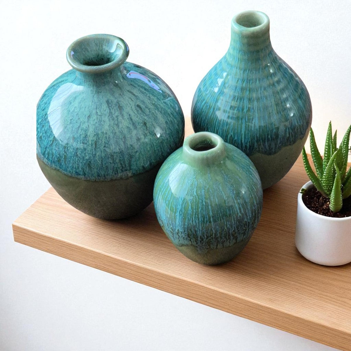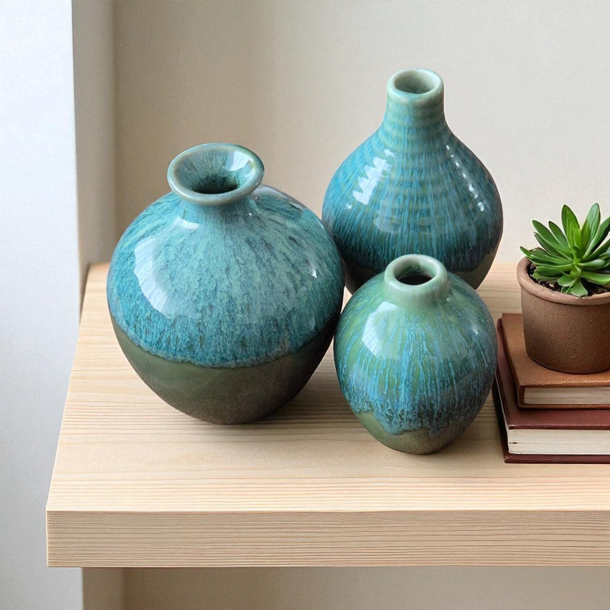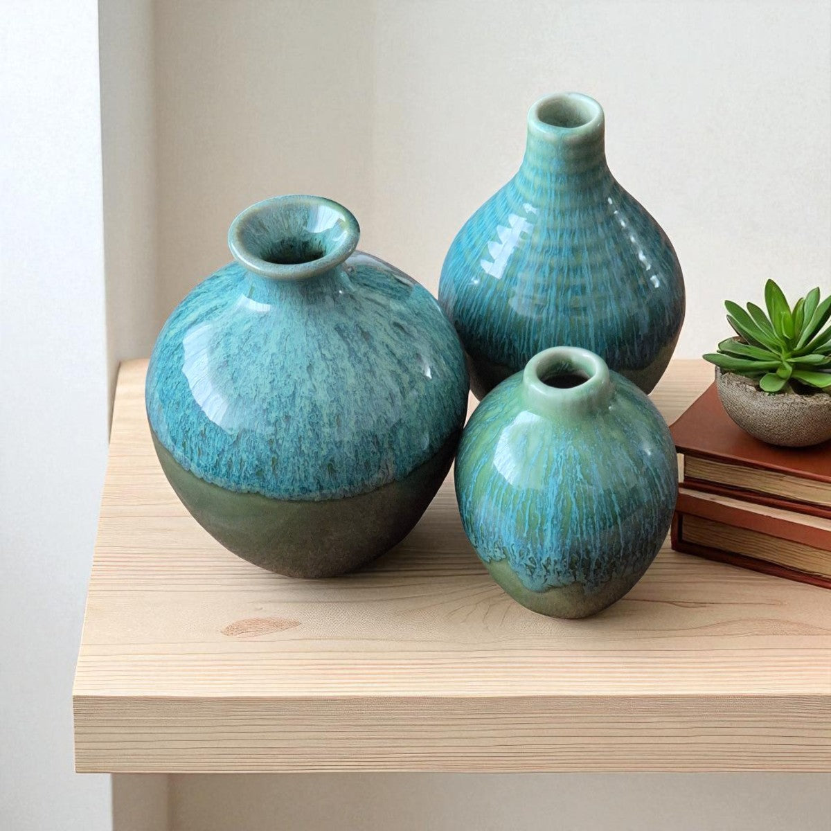 Creëer een stijlvolle en harmonieuze sfeer in huis met deze prachtige set van 3 aardewerk vazen van Masini Gifts. De vazen Amy (ø7,5 x 12 cm), Belle (ø6,5 x 8,5 cm) en Carmen (ø9 x 11 cm) zijn uitgevoerd in unieke groen-blauwe glazuurafwerkingen die perfect bij elkaar passen. Dankzij hun verschillende formaten vormen ze samen een speels en elegant geheel.