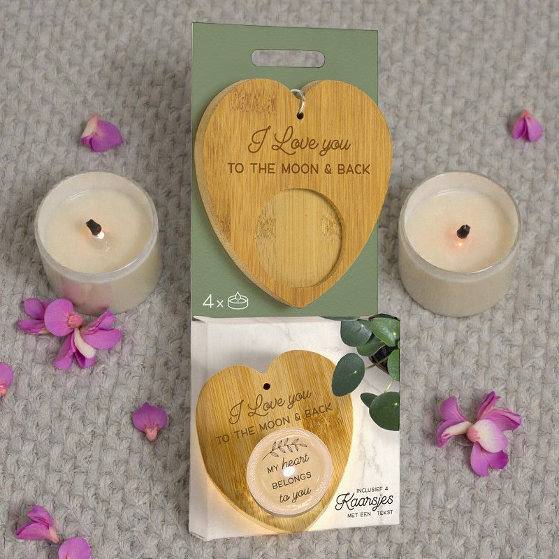 Verras iemand met een liefdevolle boodschap die langzaam zichtbaar wordt. Het Verrassingskaarsje – I love you is een origineel en romantisch cadeautje: een set van 4 waxinelichtjes met een speciaal effect én een stijlvolle bamboe waxinelichthouder in een luxe cadeauverpakking.