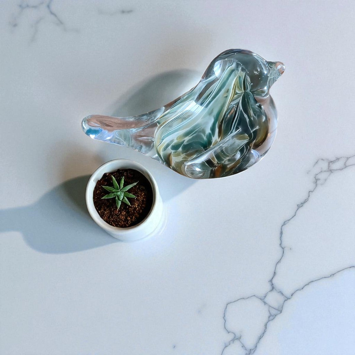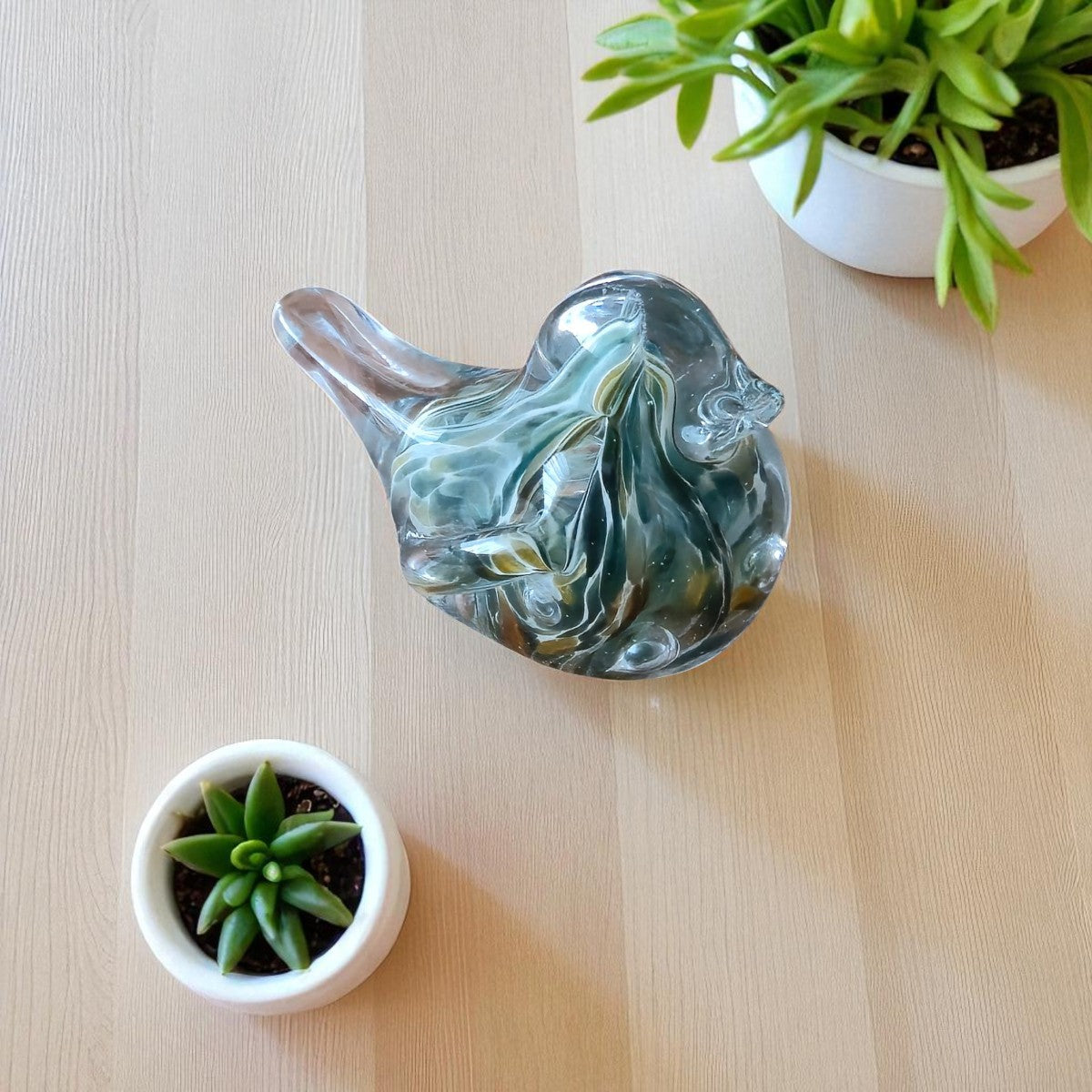 De vogel heeft een afmeting van ca. 12,5 x 6,5 x 9,5 cm (LxBxH) en ligt sierlijk op zijn plek, ideaal om neer te zetten op een vensterbank, dressoir of bijzettafel. Omdat elk exemplaar met de hand is vervaardigd, is geen enkele vogel precies hetzelfde. Je haalt dus altijd een uniek stuk in huis.